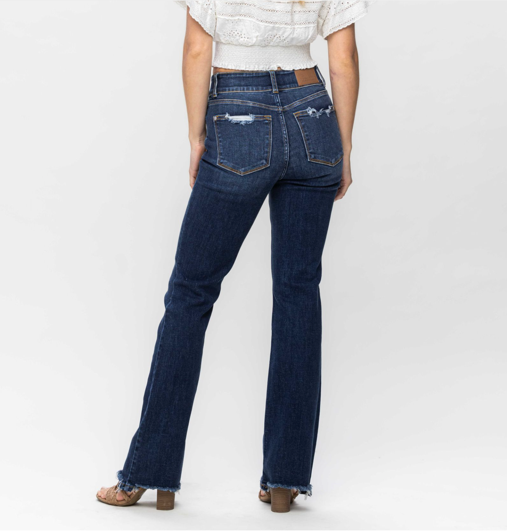 Rock a vintage vibe with our 32.5" Judy Blue Vintage High Waisted Bootcut jeans. These dark wash beauties feature a trendy frayed hem and double buttons add an extra touch of style. They have slightly less stretch for a firmer classic fit. Time to turn heads (and turn up the fun)!