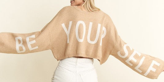 Unleash your unique style with our REVERSIBLE Be Your Self Cropped Sweater. Transform your look by wearing the inspiring message on the front or back. Available in black or grey. Embrace your individuality with this quirky and motivational sweater. Because being yourself is always in fashion!