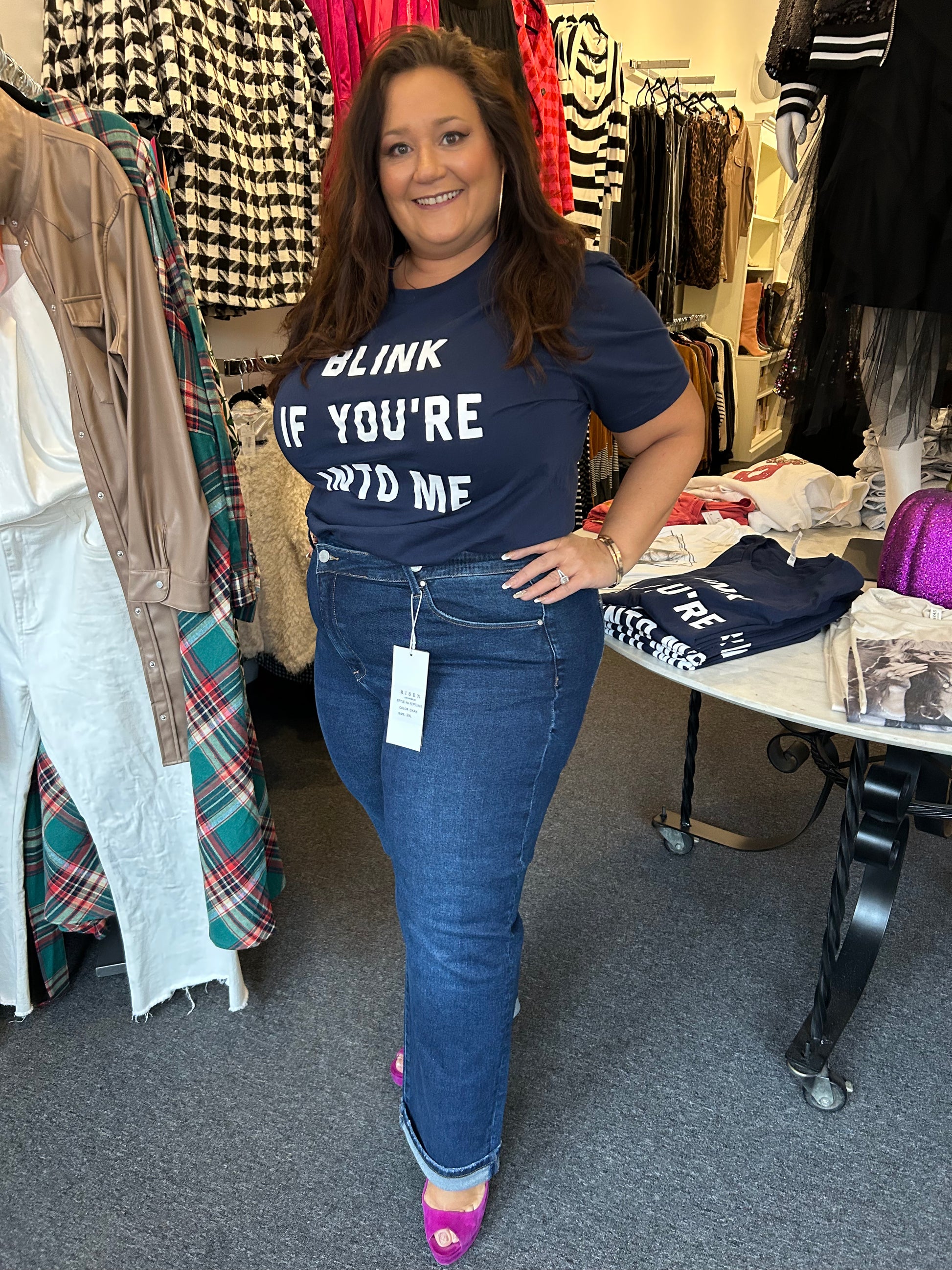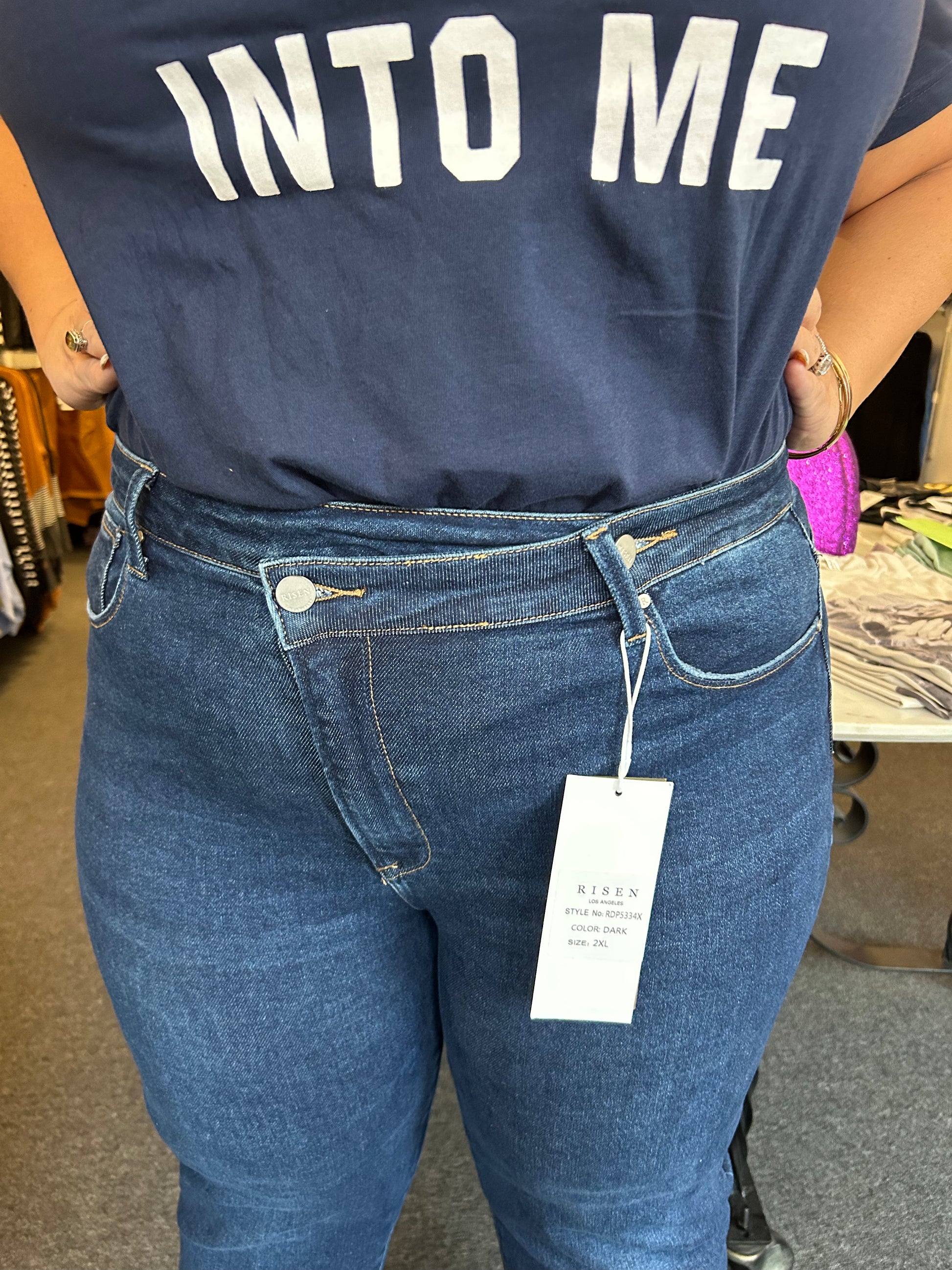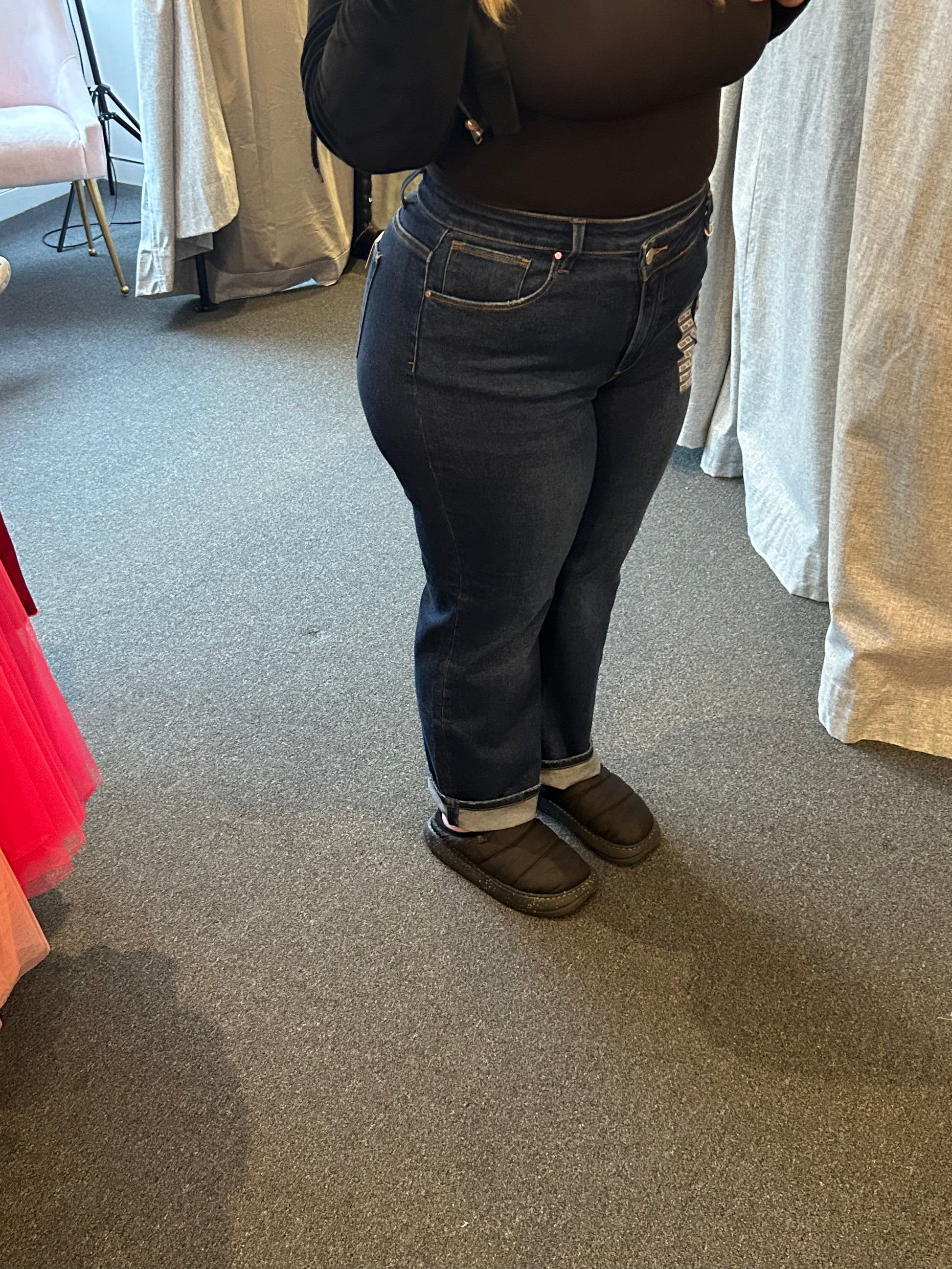 High rise cross over straight leg jeans- wear these cuffed or uncuffed. Rise: 12.5" | Inseam: 29.5" in size 1XL - true to size, 1XL - 14/16, 2XL 18/20, 3XL 22/24