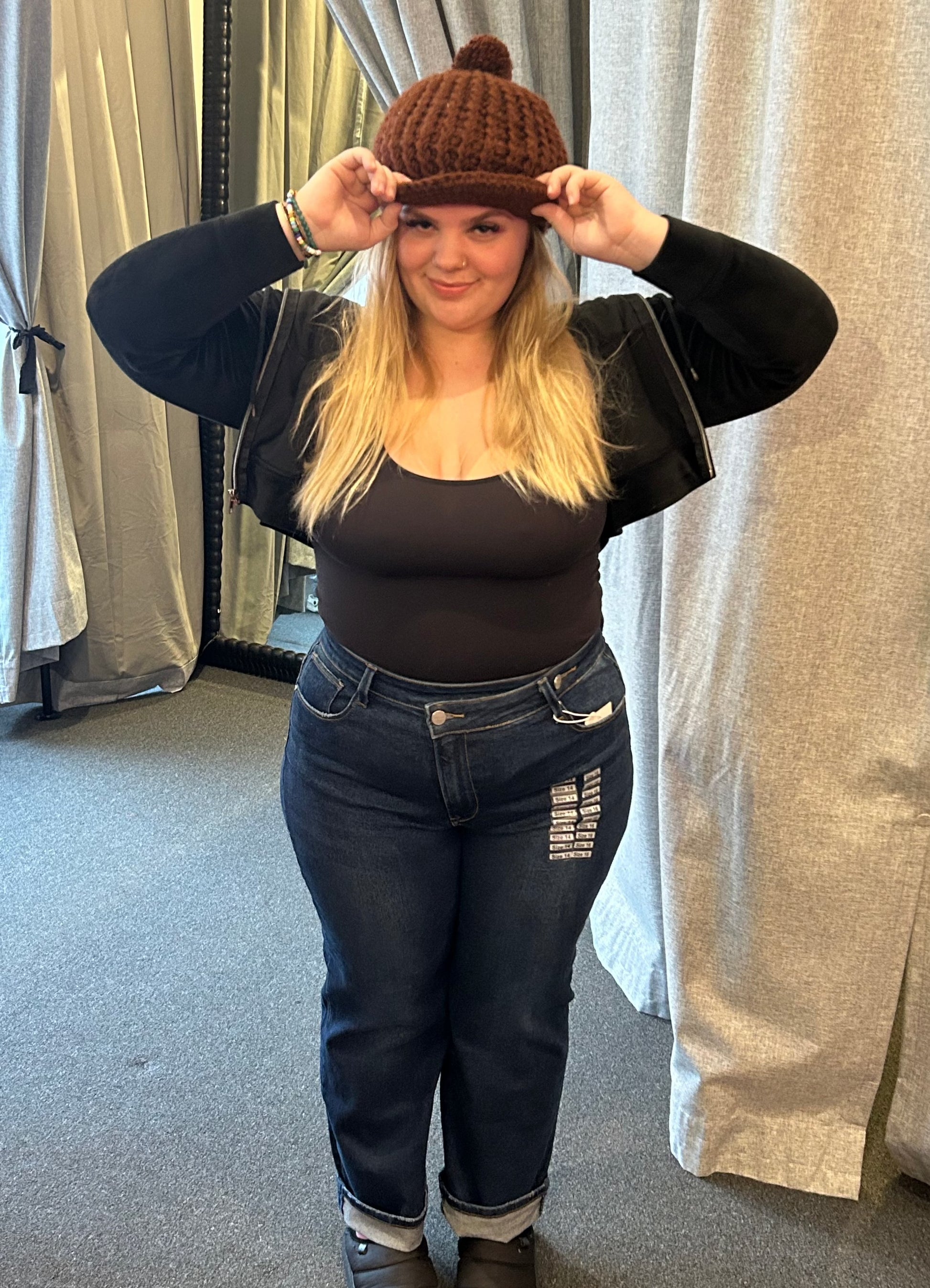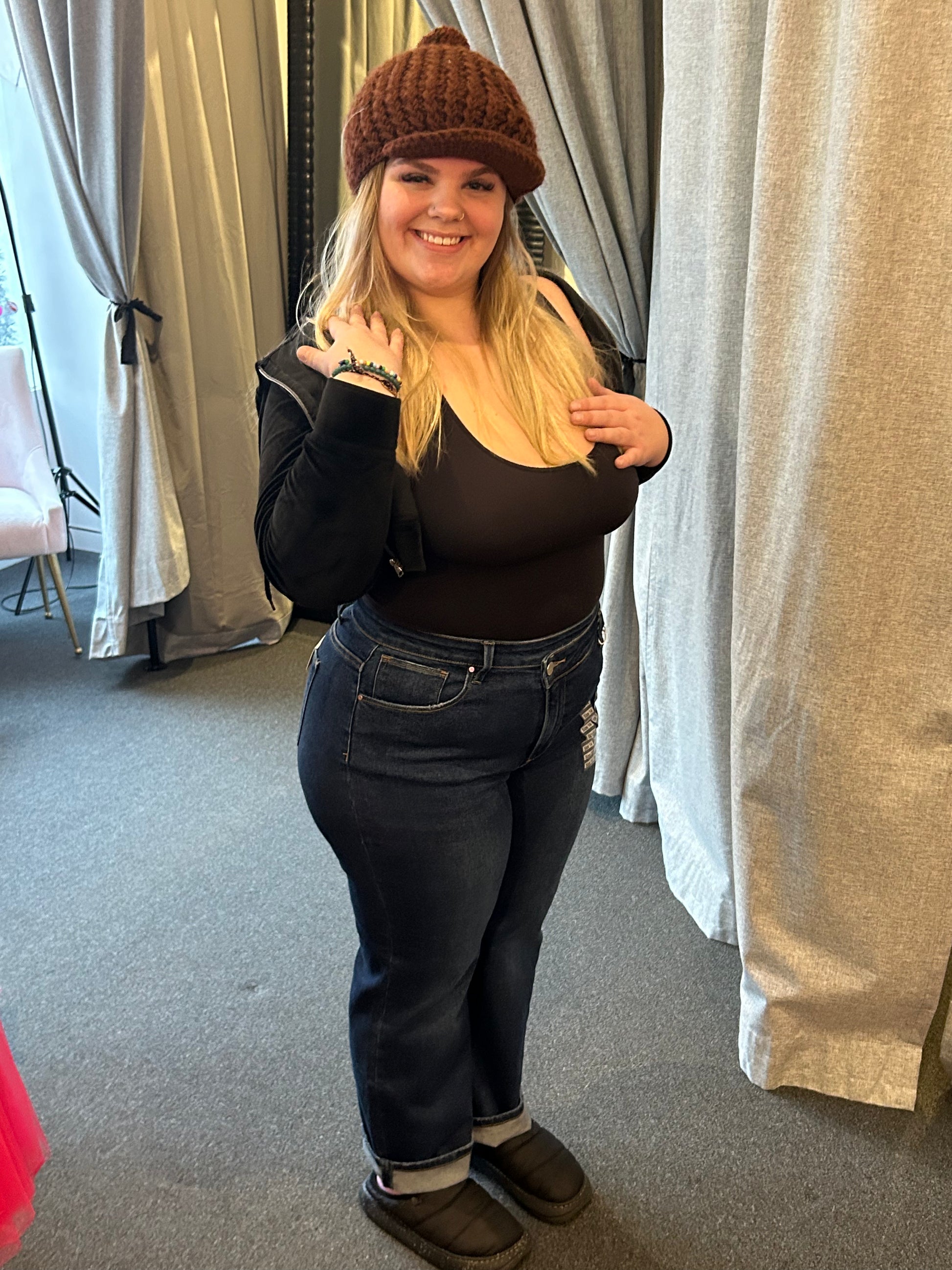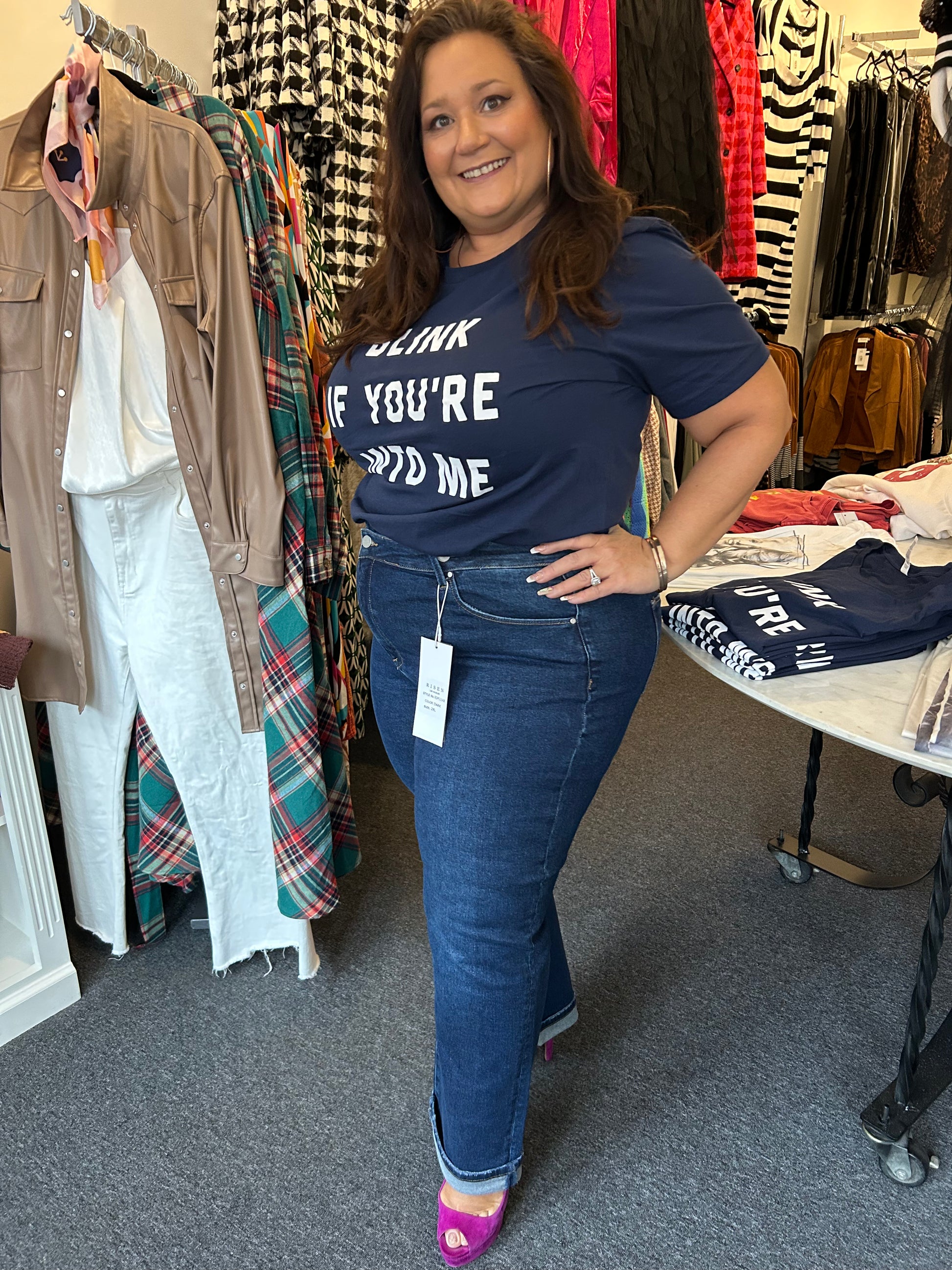 High rise cross over straight leg jeans- wear these cuffed or uncuffed. Rise: 12.5" | Inseam: 29.5" in size 1XL - true to size, 1XL - 14/16, 2XL 18/20, 3XL 22/24