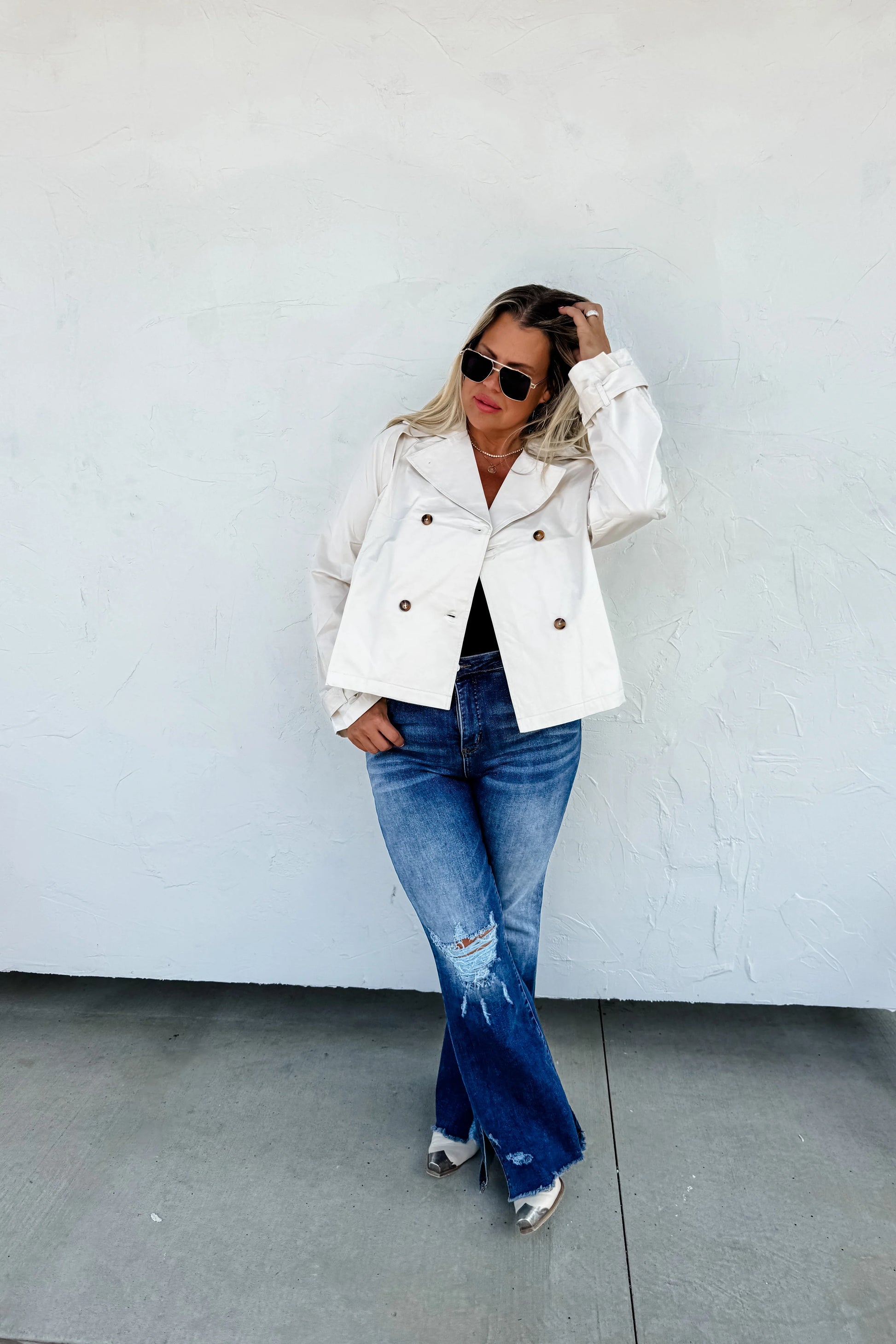 Our trendy take on a classic trench coat! Amazing button and tie cuff details, side pockets and pleated back detail. Fully working buttons that can be fastened in the front. Boxy fit, slight crop.