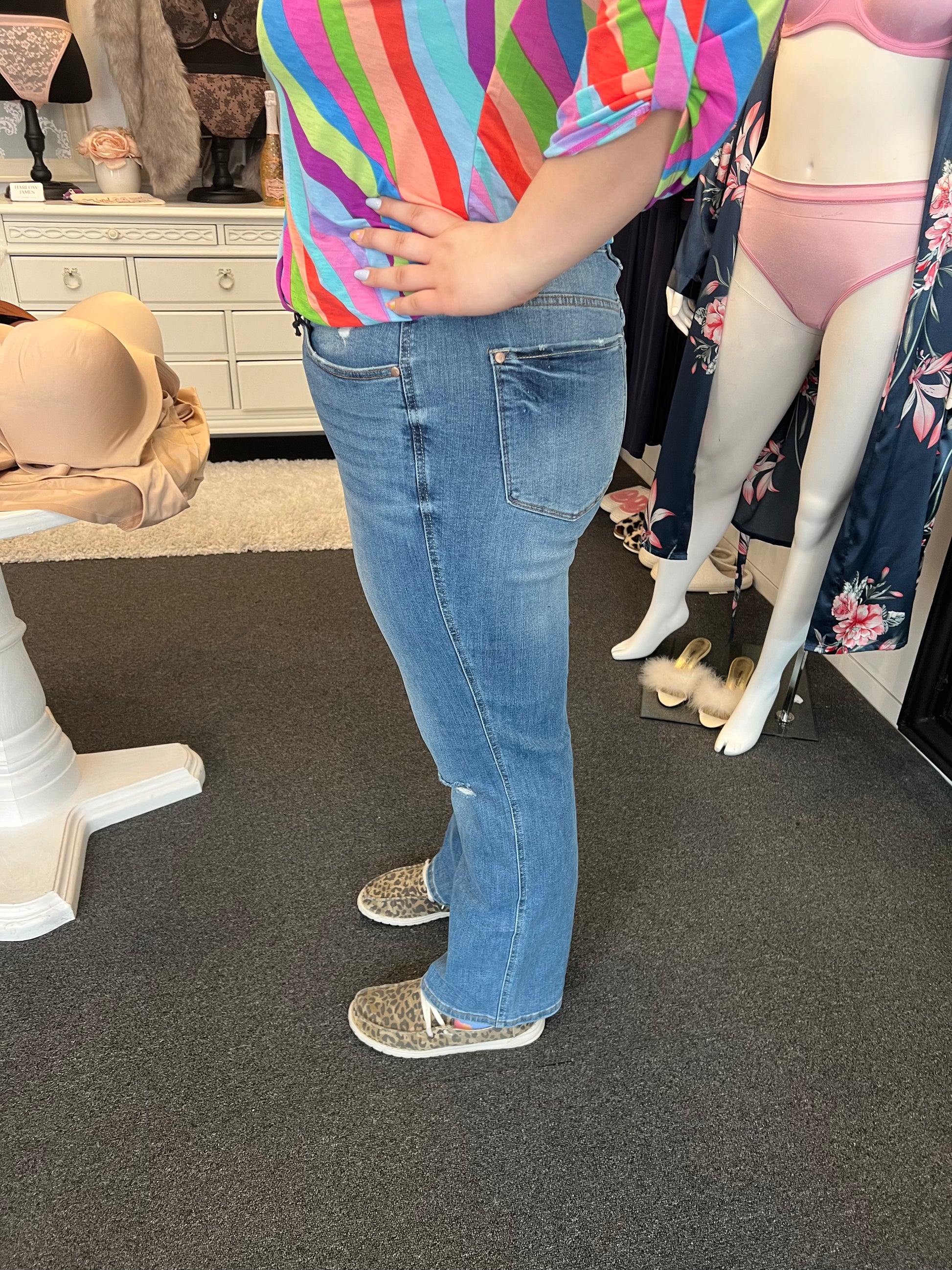 These jeans are a classic! High waist with tummy control! Featuring a destroyed knee straight leg in a medium wash. Great stretch.